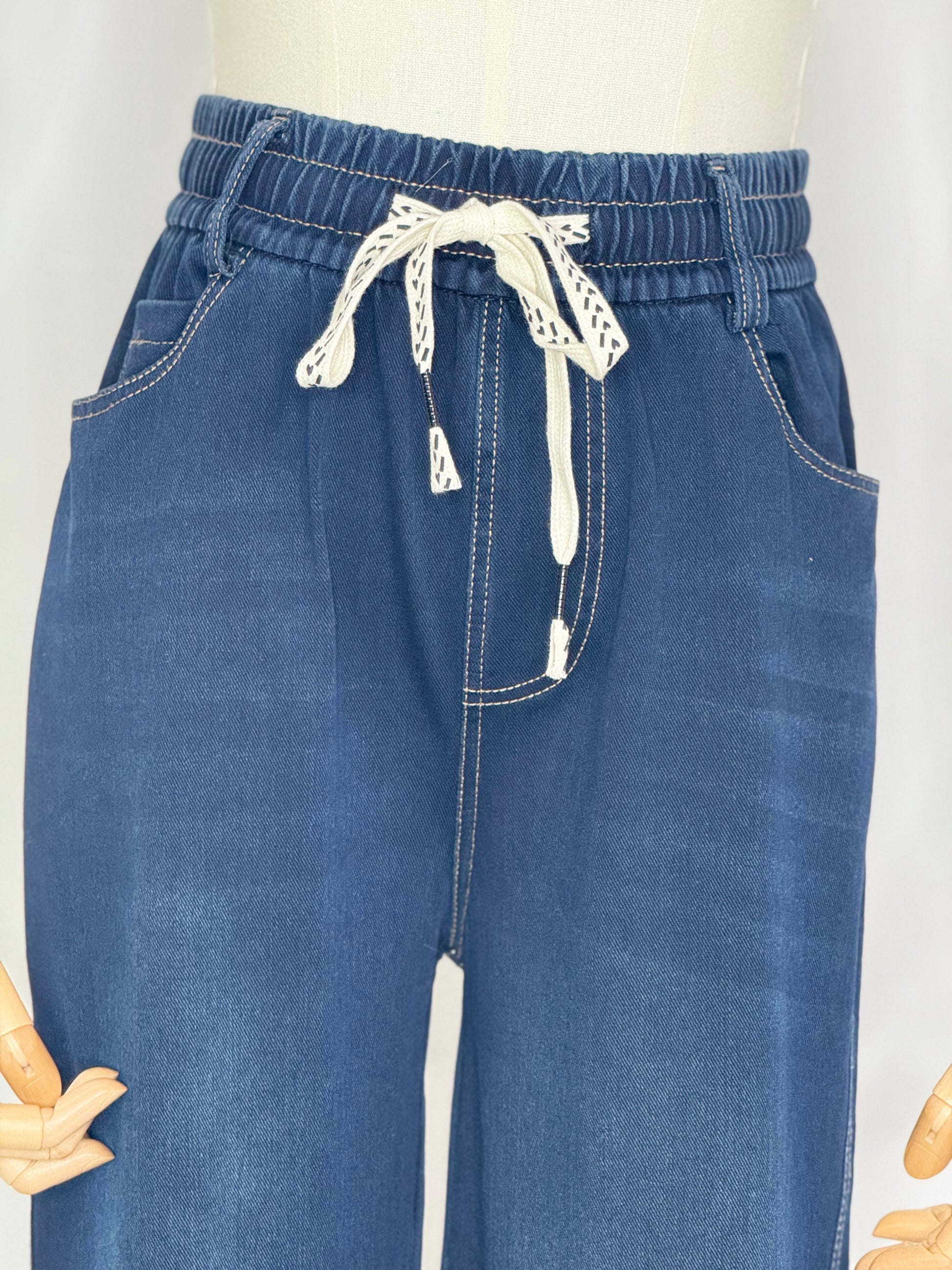 The Debbie Denim wide leg jean offers a sophisticated blend of comfort and style. Crafted from soft, stretchy dark denim, it features an elasticated drawstring waist with belt loops for a tailored fit. The wide leg silhouette aligns with on-season trends, while subtle stitching along the edges adds refined detail. Perfect for effortlessly chic looks that balance ease and elegance.