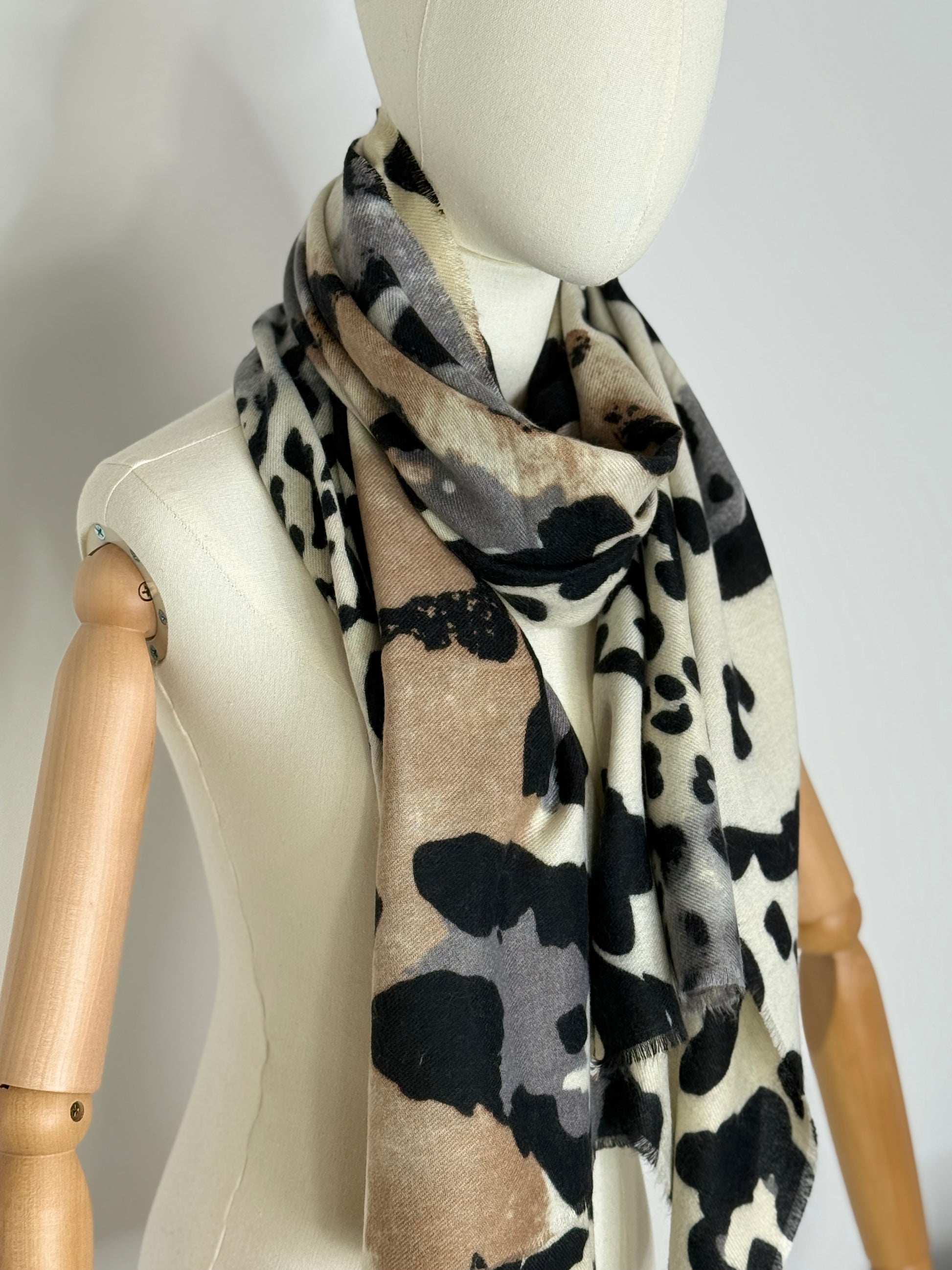 Elevate your winter style with this striking leopard print scarf, featuring an abstract design that brings contemporary flair to classic elegance. Crafted from soft, warming fabric, it's the perfect accessory to layer over coats and jumpers whilst adding a touch of refined colour and sophistication to your seasonal wardrobe. A versatile piece that transitions effortlessly from day to evening wear.